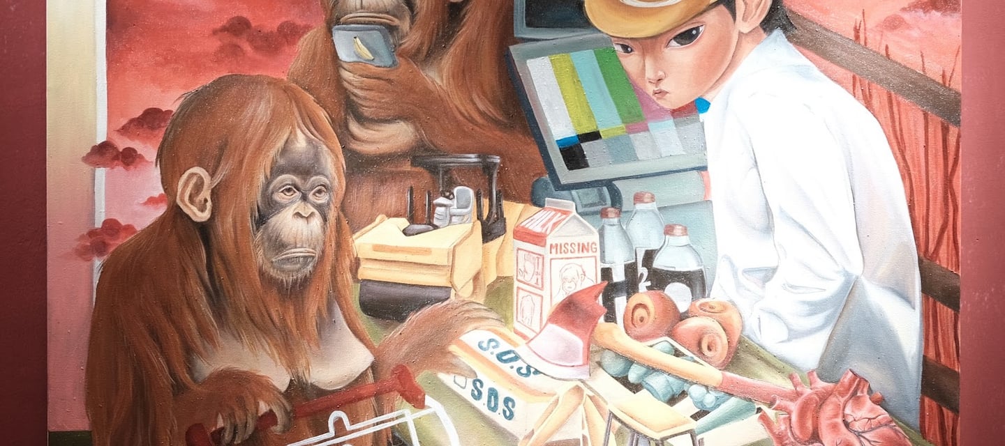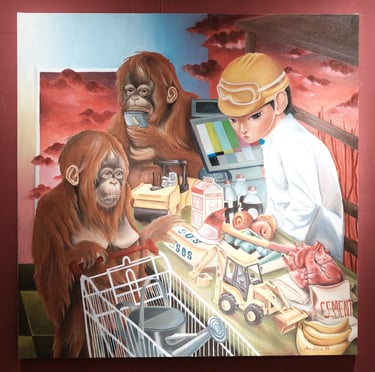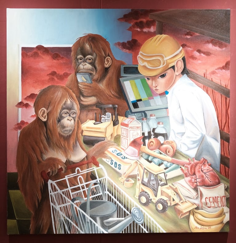 Bermata sayu, memegang troli, mengantri, lalu ia berdiri di hadapan kasir sebuah swalayan. Berdiri di atas reruntuhan hutan, ia melakukan aktivitas berbelanja, transaksi, bahkan menggenggam gawai baknya manusia. Ia meletakkan tumpukan pangan yang kini harus dibeli karena mungkin hilangnya naluri sebagai arboreal dan omnivora yang menghabiskan sebagian besar waktunya di pohon, kini hancur demi pembangunan modern yang merampas dunianya. Mainan mobil-mobilan yang kini tidak lagi menyenangkan, mengingatkannya akan suara mesin yang bergema, mencengkam menghancurkan rumahnya. Alat berat menggema; mengangkut kayu, menggali tanah dan meratakan sisa-sisa akar. Penyiram tanaman yang tertinggal di dalam torli terbayangkan air yang tak lagi membahasi tanah subur. Harapan yang pudar, kini ia tak lagi melihat kesempatan untuk merayakan kehidupan. Kapak menjadi saksi atas luka hutan, dan tumpukan karung semen yang siap mengubur sisa-sisa akar di bawah beton. Jantungnya berdetak perih, meratapi kenangan dahan-dahan yang dijelajahi dan menaunginya. Apa yang sedang dipikirkan oleh sang kasir? terlihat mencurigakan. Seseorang yang menggunakan helm proyek itu tampak tenang memindai barang-barang yang tergeletak di hadapannya. Tidak adakah celah untuk tinggal? bagaimana dengan ketenangan? atau tak cukup luaskah rumahmu, tempat kerja dan hiburanmu? Di kejauhan langit terlihat indah, tanda jalan “kabur” yang tidak lagi jelas arahnya. Dengan jantung yang masih berdetak, merindukan rumah yang tak akan pernah kembali.