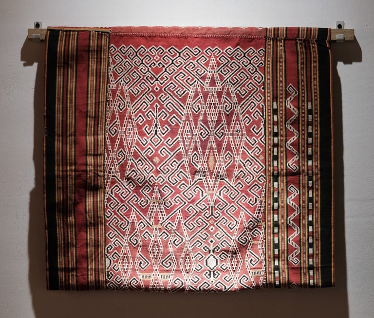 Iban weaving is not merely a product of technical skill, but a spiritual heritage that stretches across the realms of the heavens, the earthly world, and the afterlife. Taught by the goddess Dewi Jawai Indae Mendae (Kumang), weaving for Iban women is a spiritual practice, a form of inner ritual that begins with mantras and offerings, connecting the weaver to ancestors and to nature.