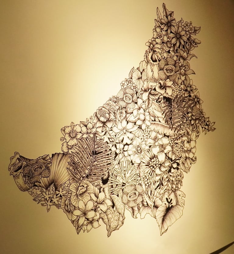 The Botanical Map of Borneo is a deeply personal, hand-drawn work that honors the island’s rich ecological and cultural tapestry. Each illustrated plant is carefully chosen to reflect the deep-rooted connections between the flora of this land and the lives, intertwining with the importance of Indigenous communities as stewards of the land they live in.