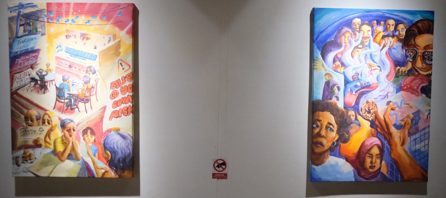 Dimensions: 50x70cmDystopia Through the Screen terdiri dari dua karya yang membayangkan seperti apa dunia jika kita hidup sepenuhnya di dalam media sosial—layaknya layar yang kita gulir setiap hari. Karya ini menampilkan realitas yang jenuh dan berlebihan, dipenuhi oleh berita palsu dan konten mengejutkan yang terus mengalir dari para pengguna internet. Ini adalah cerminan dunia sebagaimana kita memandangnya hari ini—kacau, sensasional, dan membingungkan antara kenyataan dan ilusi.