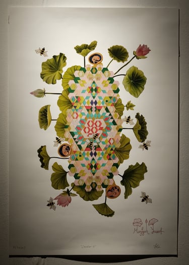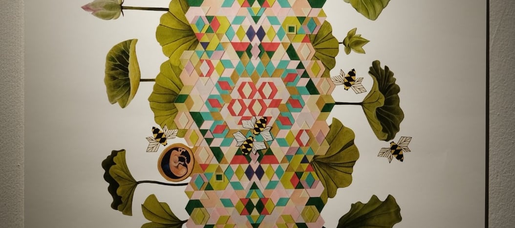Tanaman teratai tumbuh dari kolase berpola warna-warni di bagian tengah sebagai simbol penciptaan, pembuahan, dan pertumbuhan. Tiga janin yang mewakili tiga trimester berkembang dengan damai dan tanpa menyadari lingkungan di sekitarnya—hanya sadar bahwa mereka menerima asupan kehidupan dari sumber yang melekat padanya. Tanaman teratai menaungi dan melindungi janin-janin tersebut, layaknya rahim seorang ibu. Janin digambarkan dalam keadaan pasrah sepenuhnya dan sangat bergantung pada Sang Pencipta. Lebah-lebah geometris beterbangan di sekelilingnya, menyerbuki secara naluriah dan penuh tujuan. Latar putih menciptakan suasana tenang dan hening, yang menjadi kontras terhadap kerumitan pola dan bentuk di dalam karya, melambangkan keterpaduan antara Pencipta dan ciptaan.