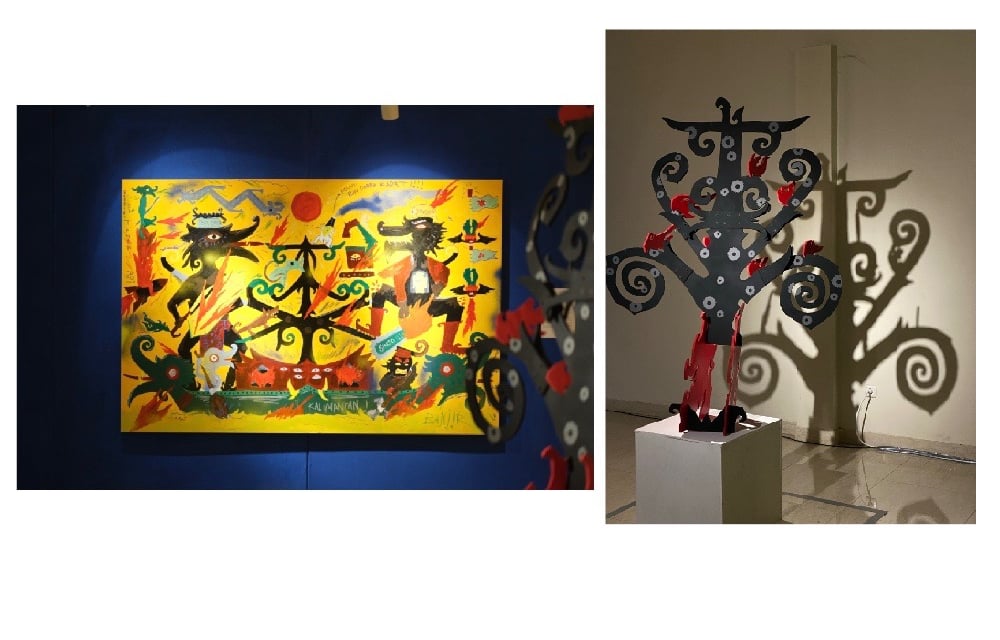 Karya ini merefleksikan ketidakseimbangan ekologis dan budaya melalui simbol visual: kepala enggang (hubungan spiritual), alat berat (invasi modern), dan batang pohon terfragmentasi (harmoni yang hilang). Lukisan di atas kanvas berbentuk atap rumah menggambarkan perlawanan masyarakat adat, dengan simbol api sebagai semangat yang terus menyala.